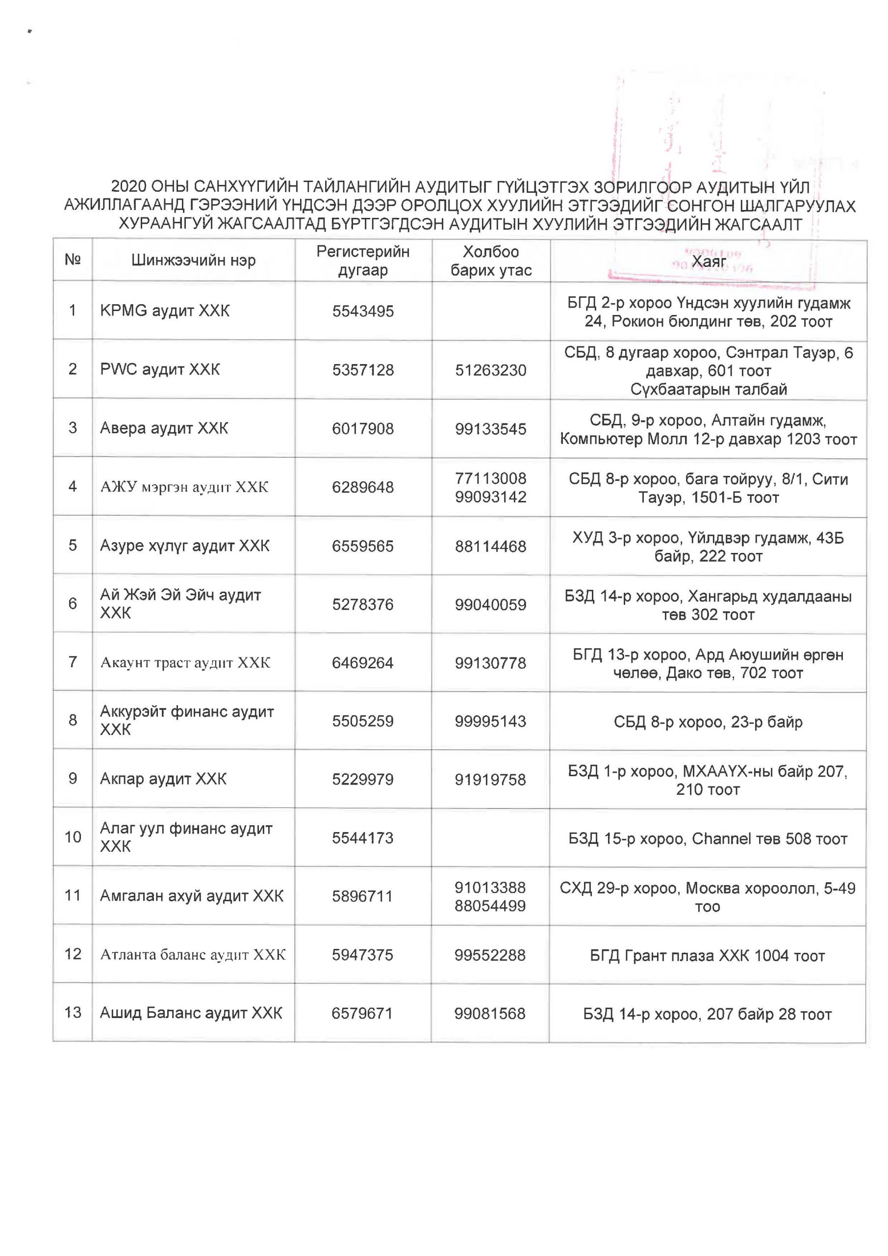 2020-12-04 — Аудитын хуулийн этгээд сонгон шалгаруулалт