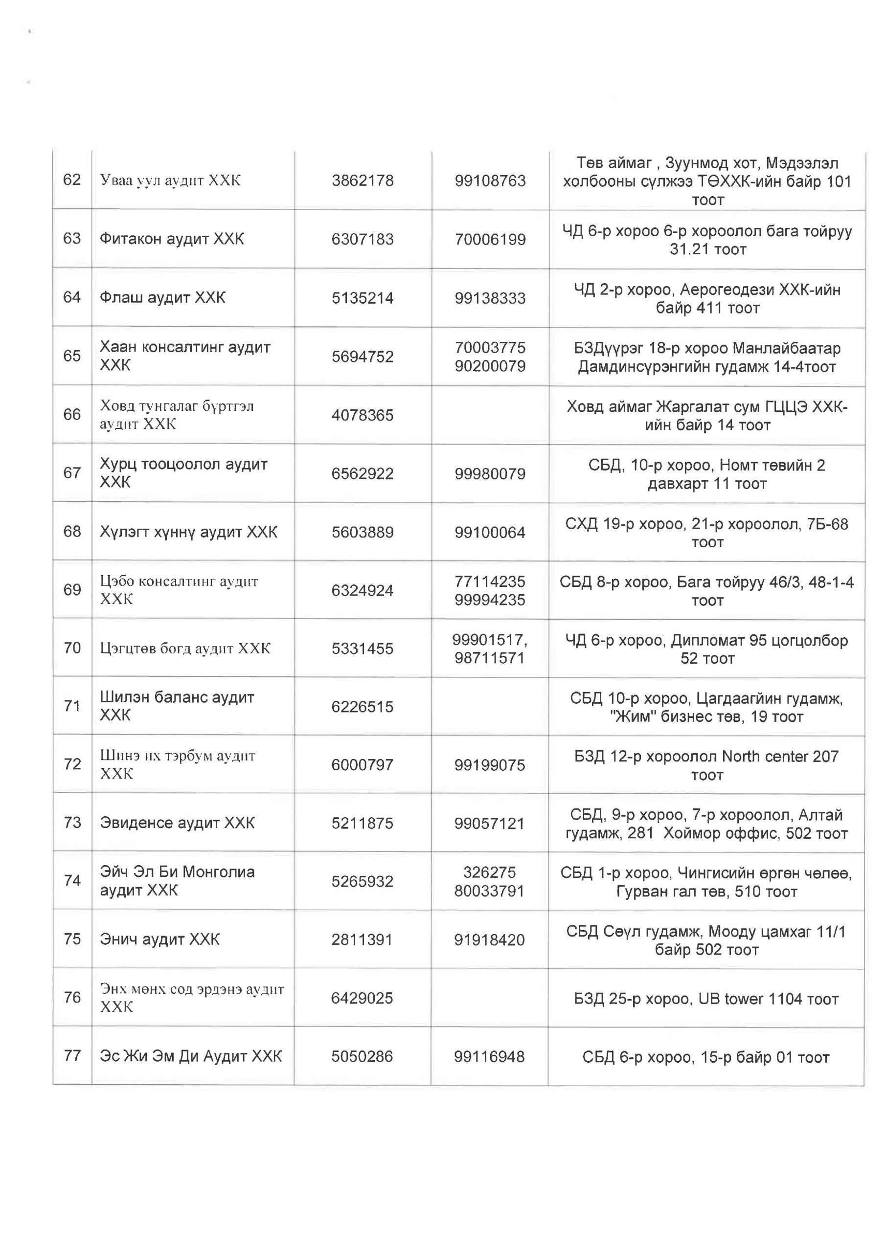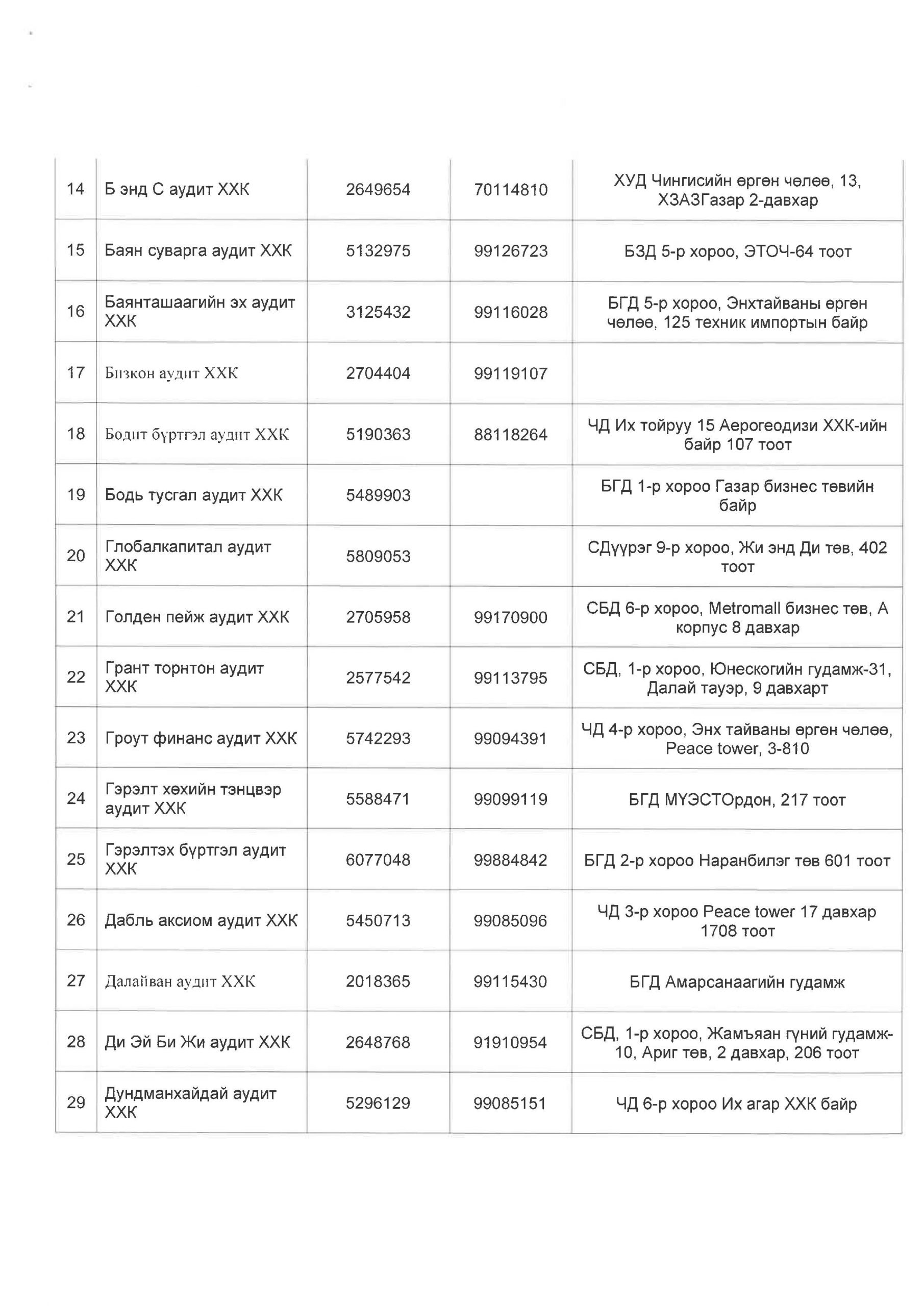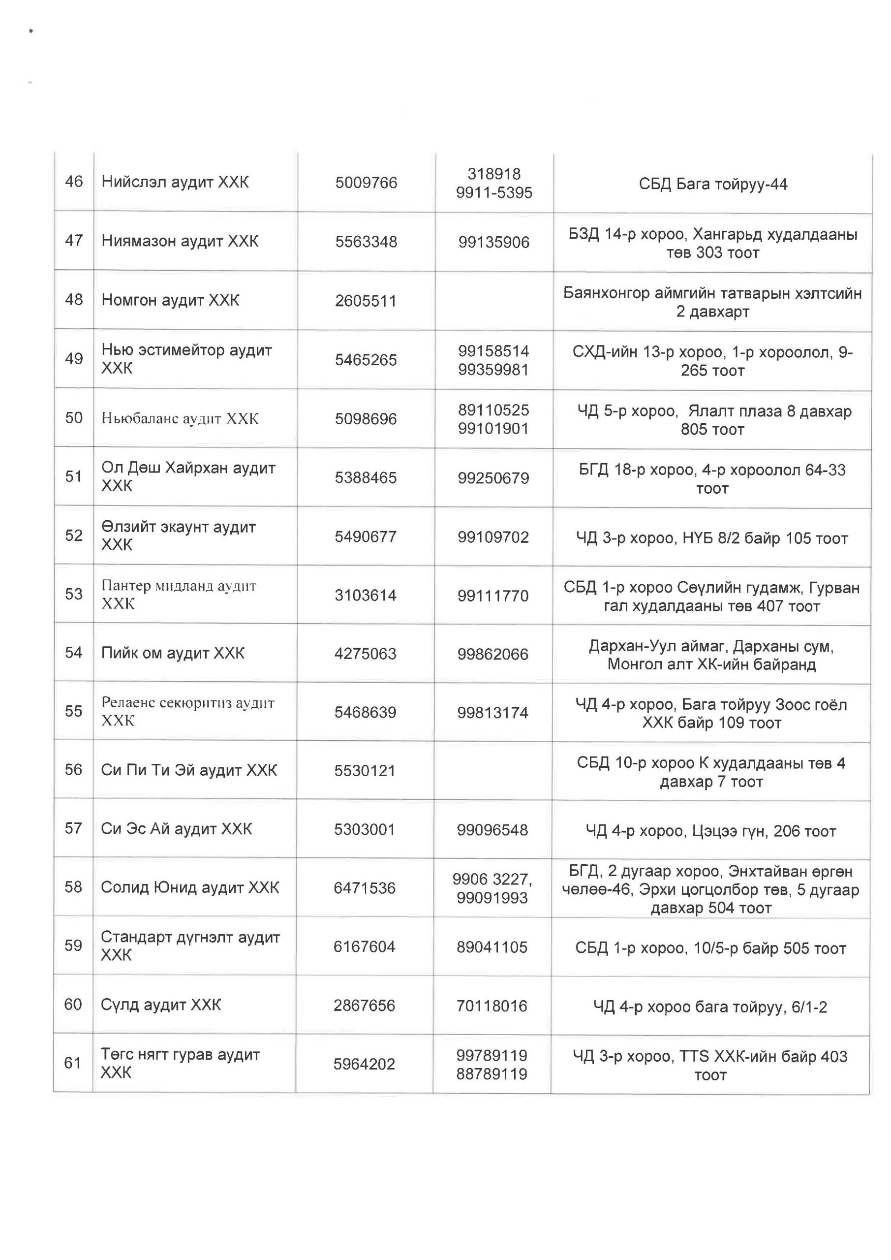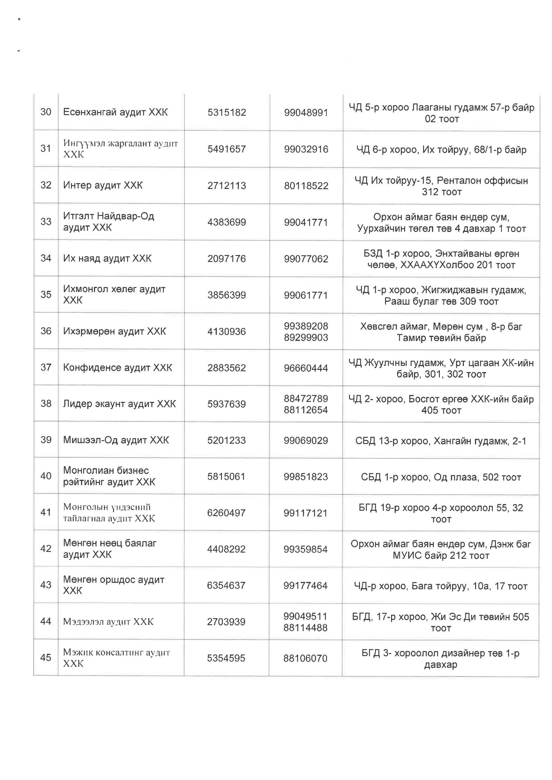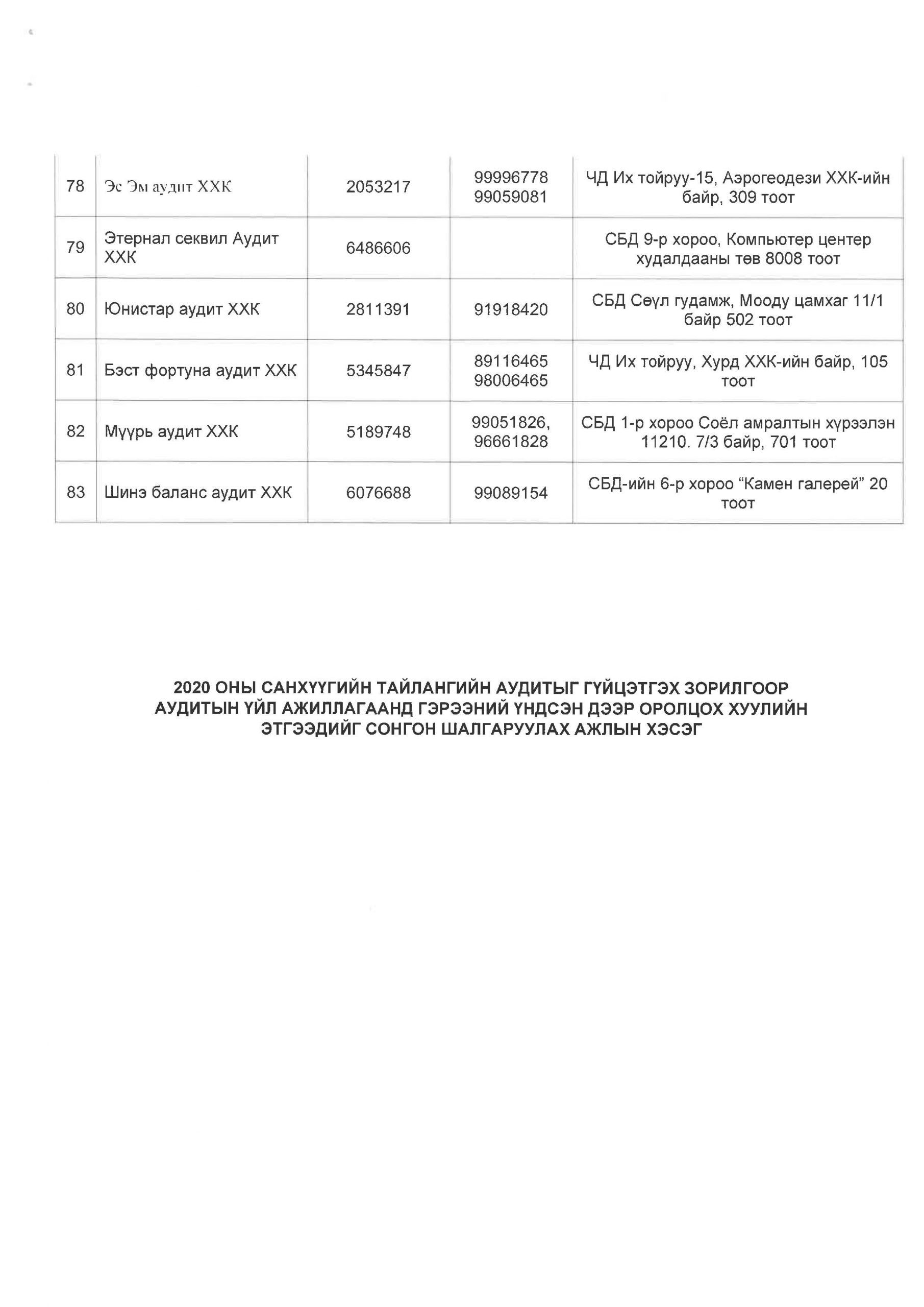 2020 ОНЫ САНХҮҮГИЙН ТАЙЛАНГИЙН АУДИТЫГ ГҮЙЦЭТГЭХ ЗОРИЛГООР АУДИТЫН ҮЙЛ АЖИЛЛАГААНД ГЭРЭЭНИЙ ҮНДСЭН ДЭЭР ОРОЛЦОХ ХУУЛИЙН ЭТГЭЭДИЙН СОНГОН ШАЛГАРУУЛАЛТЫН ХУРААНГУЙ ЖАГСААЛТАД БҮРТГЭГДСЭН АУДИТЫН ХУУЛИЙН ЭТГЭЭДИЙН ЖАГСААЛТ
