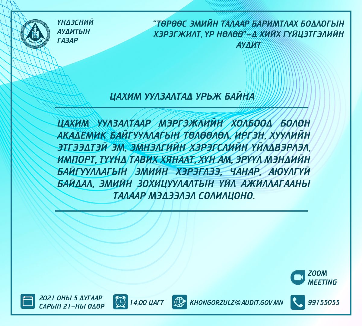 uyangae@audit.gov.mn цахим хаяг, 90089911 дугаар утсаар, цахим уулзалтад оролцохоор бүртгүүлэх бол