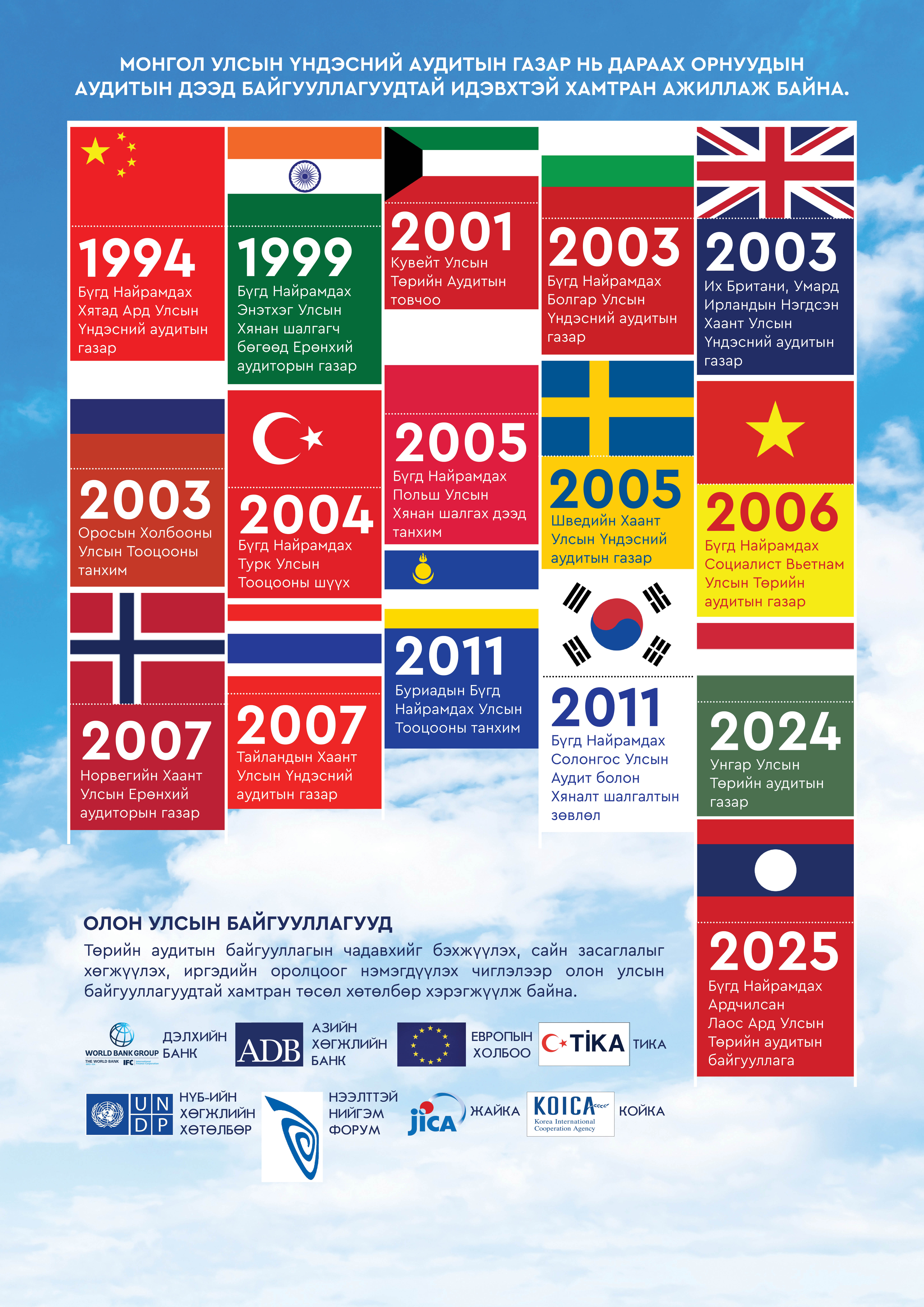 • Аудитын дээд байгууллагуудын олон улсын байгууллага (INTOSAI) – 1996 он